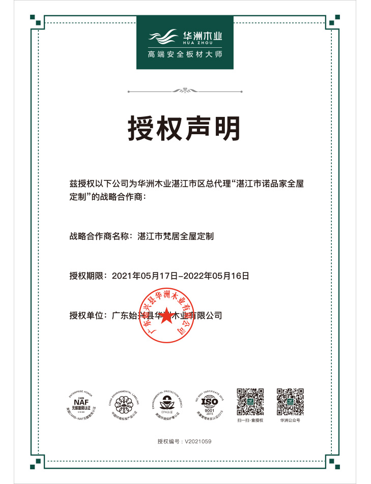 梵居全屋定制店坐落于美丽的海滨城市(湛江市)博皇建材广场一楼,是一家集销售、设计及展示为一体的高端定制体验馆,一直以超前的设计理念,一流的品质,完善的服务态度立足于市场。湛江市梵居全屋定制自成立以来一直选用华洲木业高端安全板材,为打造每一个安全、低醛环保的家而努力。