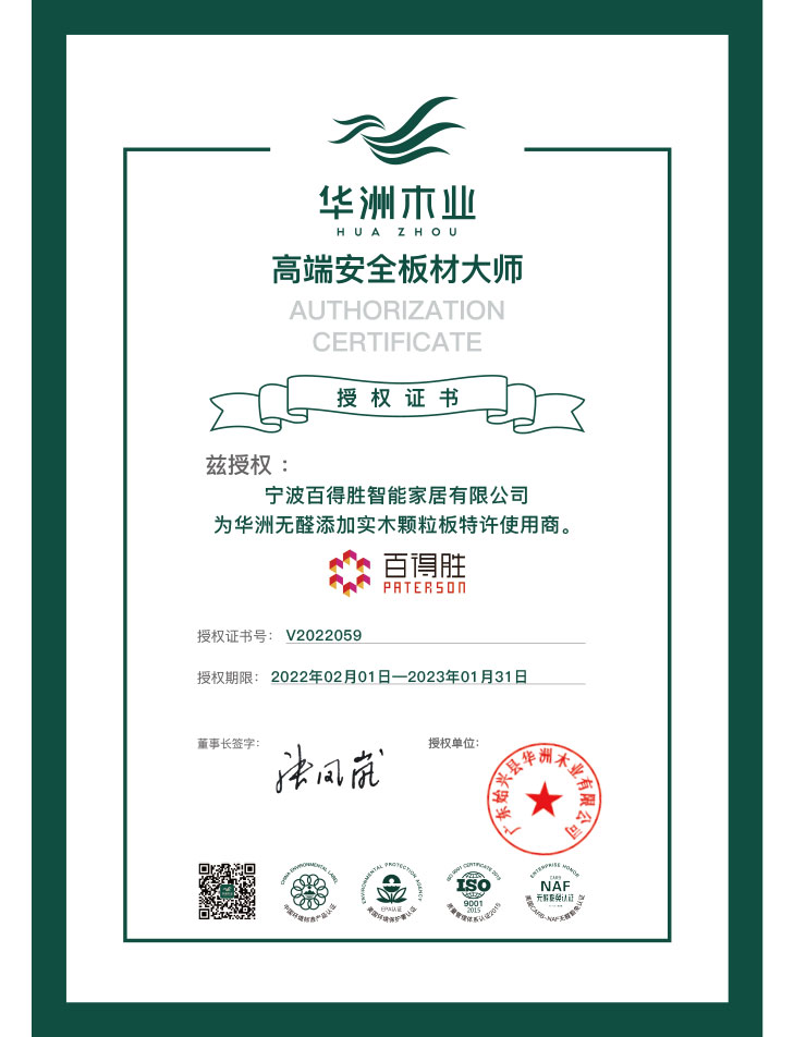 百得胜凭借精良的工艺,优良的德国豪迈、温康纳生产设备,好看、好用、环保的品质,获得了机构的赞赏并通过ISO国际质量体系认证。
